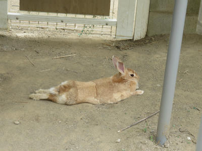 飼育小屋で飼われている「モコちゃん」は夏バテのようすです。今日は地表が少し冷えているようで、小屋から出てきて涼んでいます。