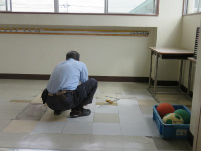 校務員さんが、2階廊下のタイルの張替えをしてくださっています。一枚ずつ古いタイルを剥がし、新しいタイルに替える気の遠くなるような作業です。暑い中、ありがとうございます。感謝して、大切に使いましょうね。