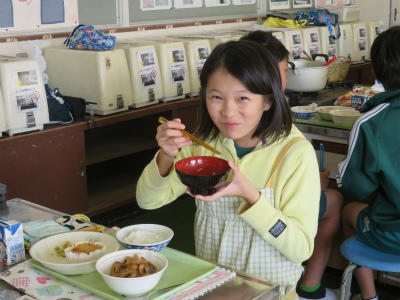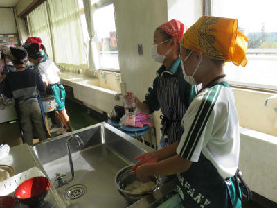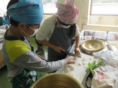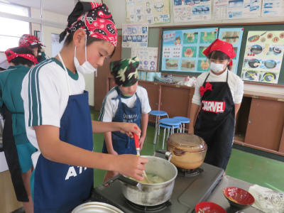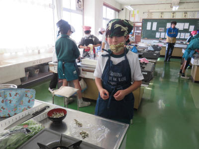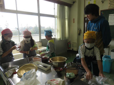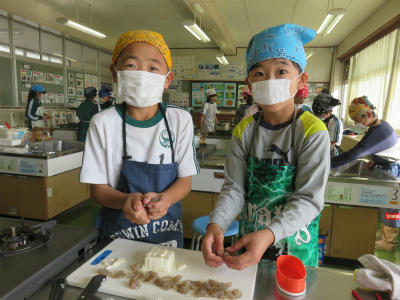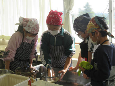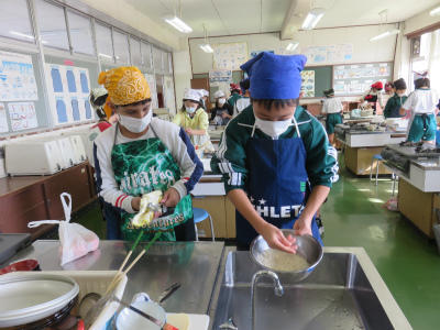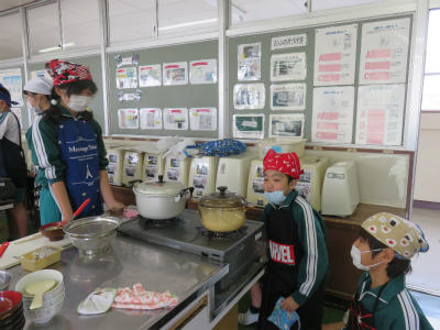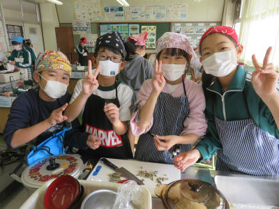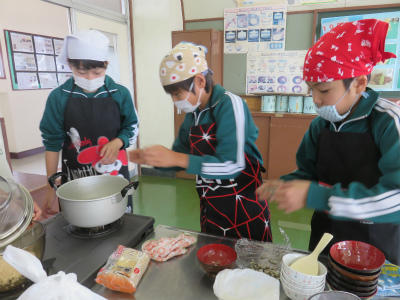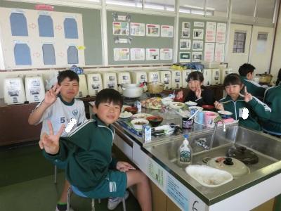 11月21日(水)3・4校時、家庭科室において、5年1組の調理実習が行われました。今日は、お鍋でご飯を炊き、煮干しで出汁をとって、みそ汁を作りました。みそ汁の具はそれぞれ子どもたちが持ち寄りました。御家庭の御協力により、大根、人参、しいたけ、れんこん、白菜、ほうれんそう、しめじ、とうふ、油揚げ、わかめ、たまねぎ、などそれぞれのグループのこだわりが見えました。全部の班のみそ汁をいただきました。甲乙つけ難し。ほんとうにおいしくできました。今日は、自信を持っておうちの夕飯で復習してみて下さい。