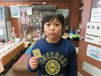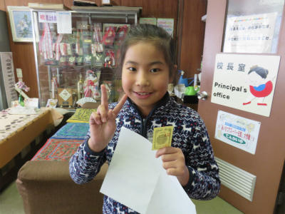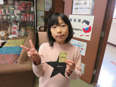 12月17日(月)「立野っ子校長検定名人」が、本日誕生しました。今年度3人目、通算5人目の快挙となります。約束のメダルを授与しました。3年生の女子です。おめでとうございました。よくがんばりましたね。毎日よく校長室に足を運びました。