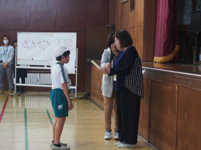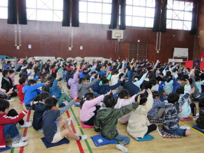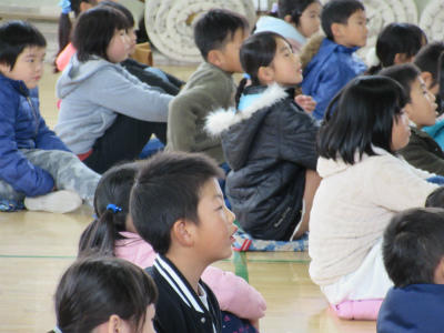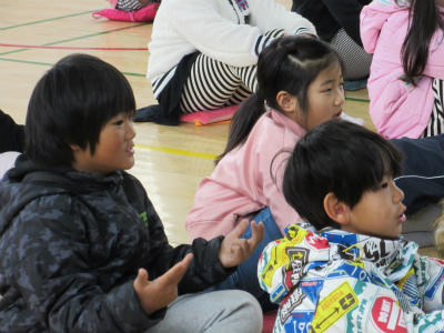 先生たちや子どもたちが、陽の差す体育館で笑顔で語り合っている。子どもが一生懸命に先生の話を聞いている。そんな場面に、今日は十分心が温まりました。5年生!さすがです。