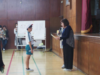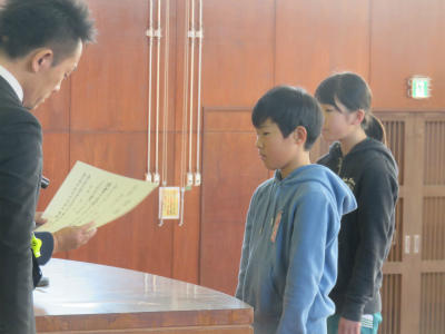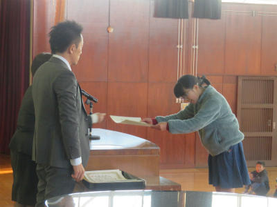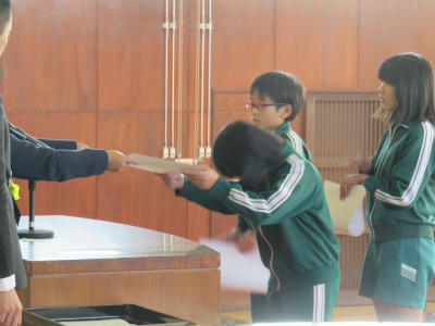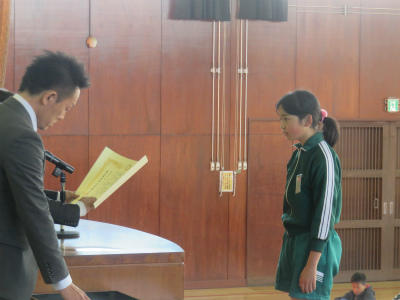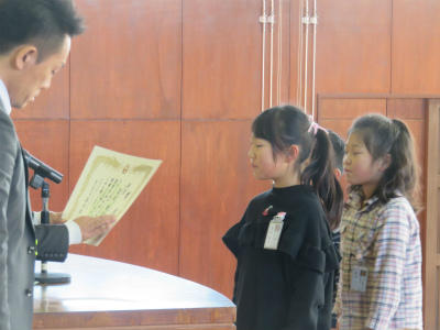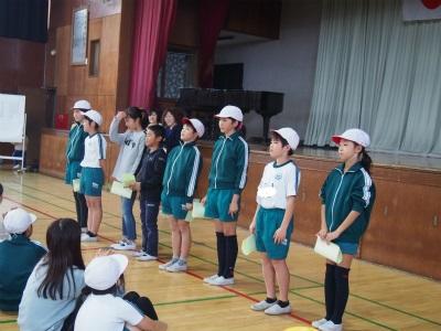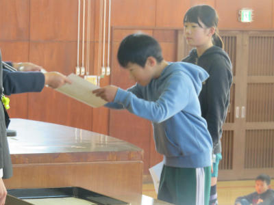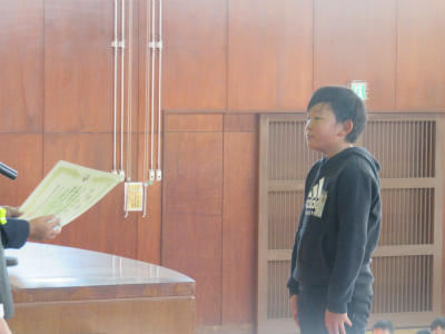 代表児童からは、校内競書会のこと、持久走大会のことが述べられました。努力を重ねて来年も頑張るという決意が語られました。大変立派な発表でした。