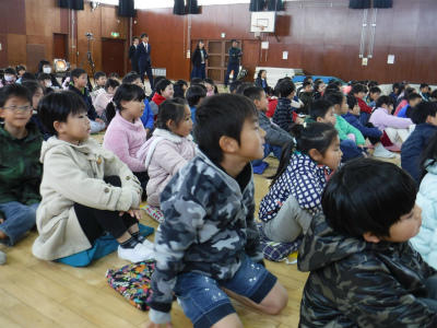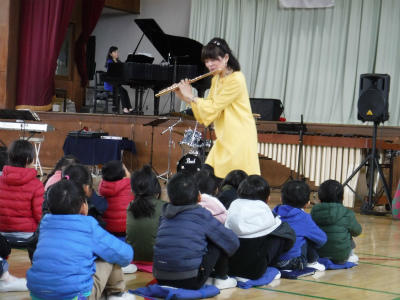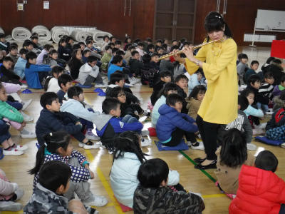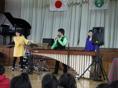 12月11日(水)10:00~体育館において、「文化芸術による子どもの育成事業 音楽鑑賞会」が行われました。今日は、JILTONE(ジルトーン)<フルート、マリンバ&パーカッション、ピアノのトリオの演奏グループ>による演奏会です。低学年、中学年、高学年と3つの学年に分けての鑑賞会となりました。いろいろなリズムに心を弾ませ、楽しい時間となりました。文化庁による芸術家の派遣事業 音楽鑑賞会が本校で開催されたことは、またとない幸運であったと思います。