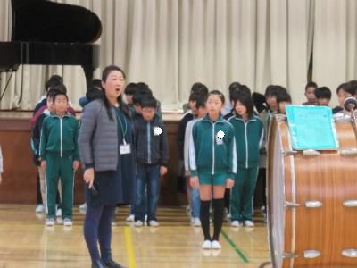 12月12日(水)朝、体育館において「音楽朝会」が行われました。元気な歌声が体育館いっぱいに響きました。1年生も元気いっぱい。この雨も上がるでしょう。