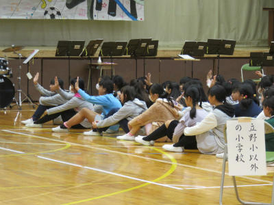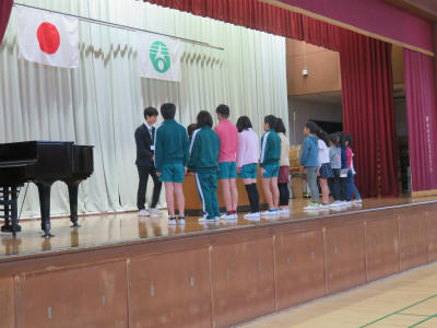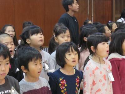 12月12日(水)朝、体育館において「音楽朝会」が行われました。元気な歌声が体育館いっぱいに響きました。1年生も元気いっぱい。この雨も上がるでしょう。