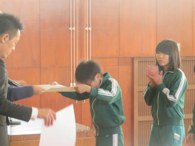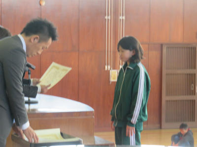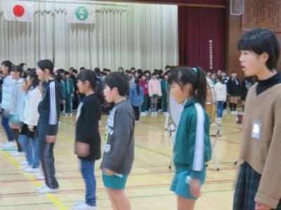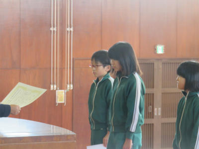 代表児童からは、校内競書会のこと、持久走大会のことが述べられました。努力を重ねて来年も頑張るという決意が語られました。大変立派な発表でした。
