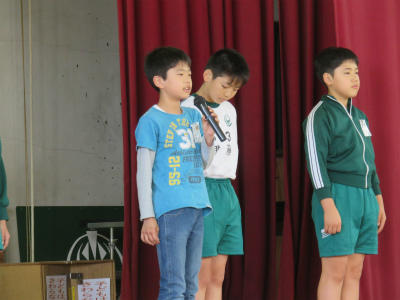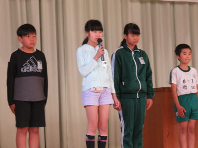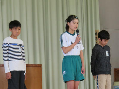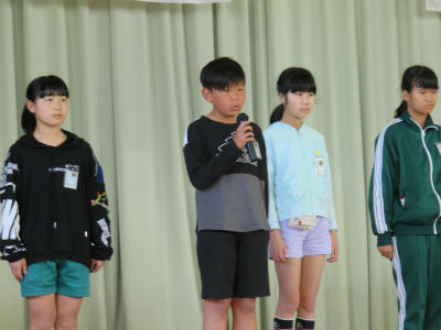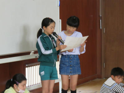 5月15日(水)朝、体育館において「児童朝会」が開かれました。今回は、それぞれの委員長が活動内容などについて、発表をしました。