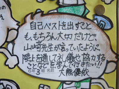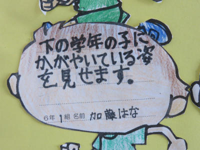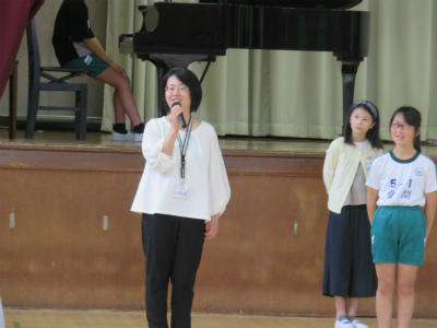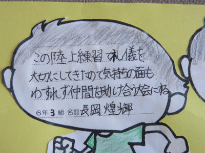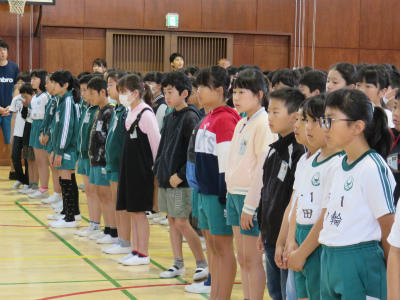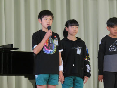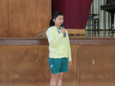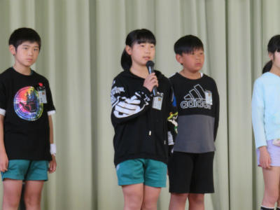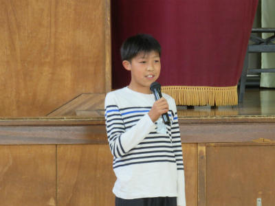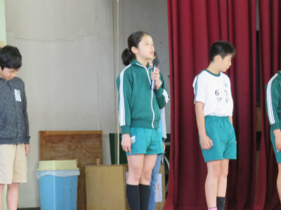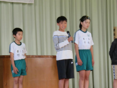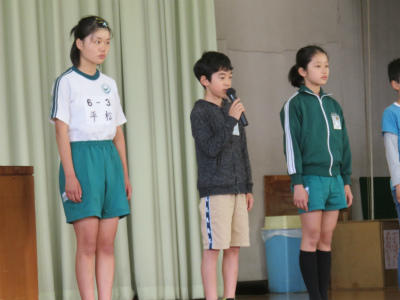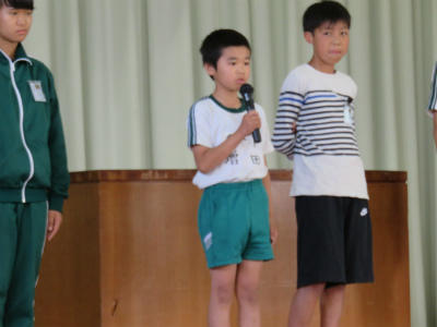 原稿を持たず、自分の言葉で滑らかに上手に表現することができました。また、礼や返事がとても立派でした。こうやって「下の学年が憧れる上級生」となっていくのだなとうれしく感じました。また、中学校の体育祭では、生徒会長が原稿なしで、自分の思いを堂々と述べることに触れ、そんな中学生になってほしい、との思いも伝えました。5・6年生が体育館に残ったところで、校長から「目指す学校に日に日に近づいている」ことのお礼を言いました。とにかく5・6年生の話を聞く態度はすばらしい。今朝もそう思いました。ありがとうございます。