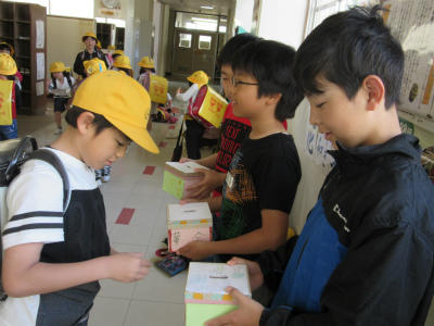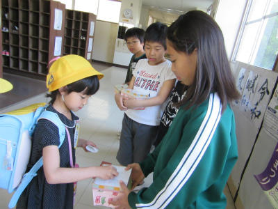 6年生の給食準備のお手伝いも先週で終わりました。今日から、1年生は担任の先生と一緒に自分たちで給食の配膳をしています。交通指導員さんからも地域のみなさんからも「1年生、しっかりしているね。」とお褒めの言葉をいただいています。給食当番はしっかり白衣を身につけ、上手に配膳していました。きっとお家でもお手伝いをしているんだろうなぁ。さすが、です。頑張れ、1年生!!