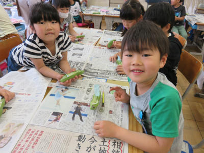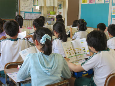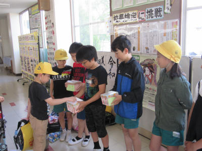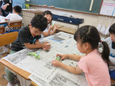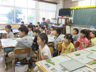 5月21日(火)1・2校時、1年生が「そらまめのさやむき」に挑戦しました。調理員さんからの説明をよく聞いて、とても上手にむくことができました。さやは舟にして、たらいに浮かべました。給食では、豆苗とともにそらまめをおいしくいただきました。