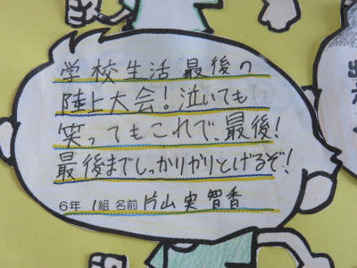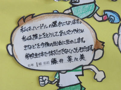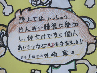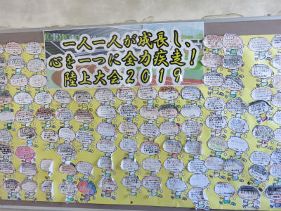 5月23日(木)、市内陸上大会は6月6日(木)、宮川小学校において開催されます。立野小学校でも練習に熱が入ってきました。階段の掲示板には、立野っ子の決意が掲示されています。今年も頑張ります!!