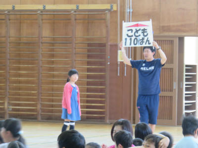 5月24日(金)3校時、体育館において1年~3年生を対象に「防犯教室」が開催されました。埼玉県警察あおぞらの皆様に御指導をいただきました。①一人にならない②ついていかない③大声で助けを呼ぶ④だれとどこで何時まで、遊ぶ相手を家の人に話す という4つの約束をしました。校長からは「自分の命を守れるということは友達の命も大切にできるということ」「自分で判断して命を守る場面がある」という話をしました。お家でも重ねての御指導をお願いします。