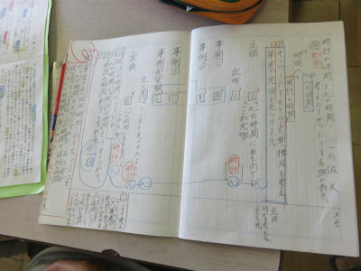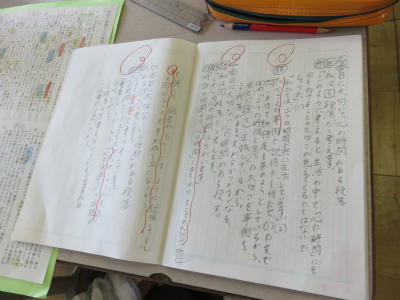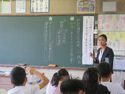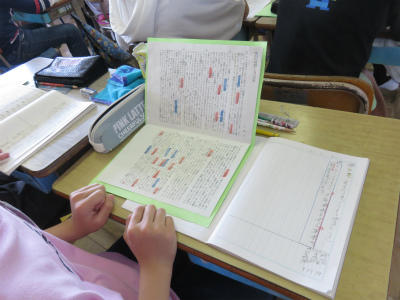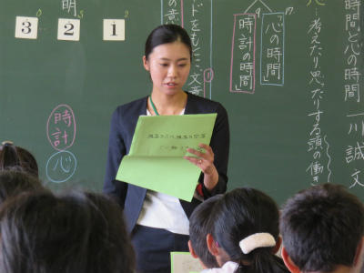 今日の単元は「時計の時間と心の時間」です。筆者の意図を捉え、自分の考えを発表することをねらいとしています。学びについての躾をよく受けた学級であると感じました。「手をしっかりあげて!」「自信をもって!」と先生の声が飛びます。期待に応えようと頑張る子どもたちが、とても頼もしく見えました。丹念にノート指導を積み重ねた様子もよくわかりました。