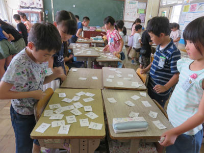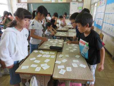 6月14日(金)3校時、3年2組では「算数」の授業です。たくさんのカードの中から、先生の言った数字とは異なるカードを取っていきます。なるほど、100から先生の言った数を引いた数字のカードを取っていくわけです。暗算ですね。意欲的に取り組んでいました。