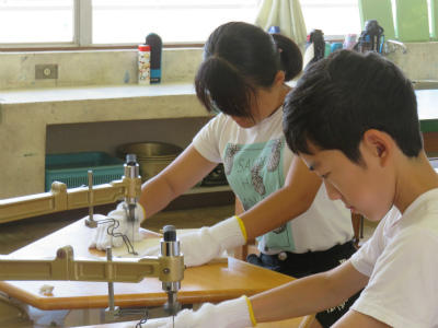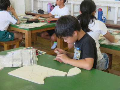 6月18日(火)1・2校時、図工室において6年4組の図工の授業がありました。今日は、木製のパズルを製作中です。器用に糸のこを操り、思い思いの形にしあげていきます。手を置く位置に注意しながら慎重な作業です。ヤスリをかけて形を整えています。完成するのが楽しみですね。