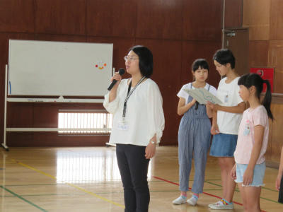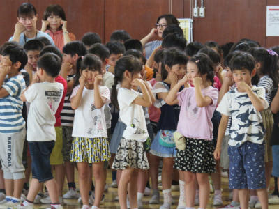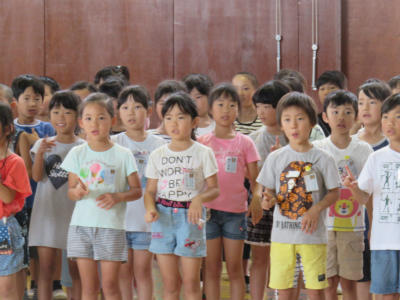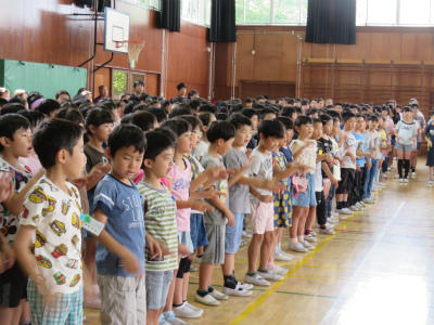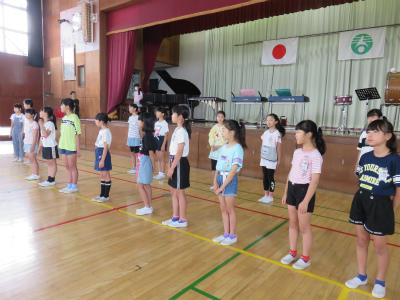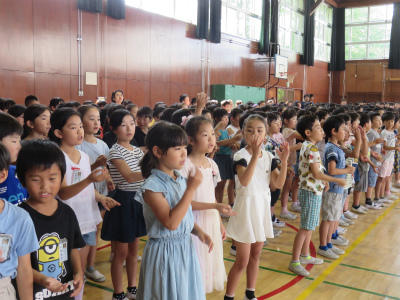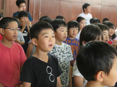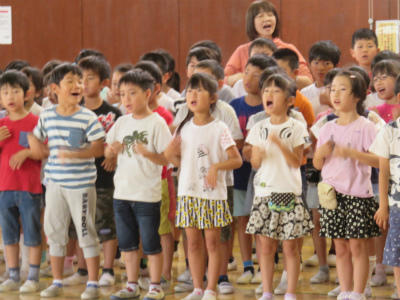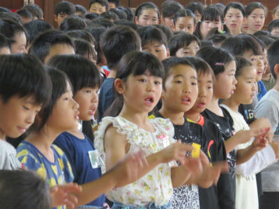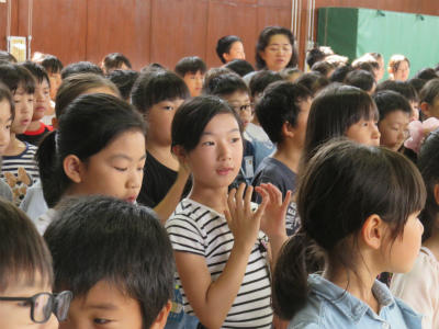 6月19日(水)朝、体育館において音楽朝会が開かれました。6月の歌「世界中の子どもたちが」を元気よく歌いました。
