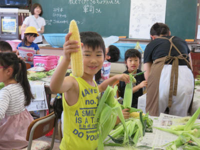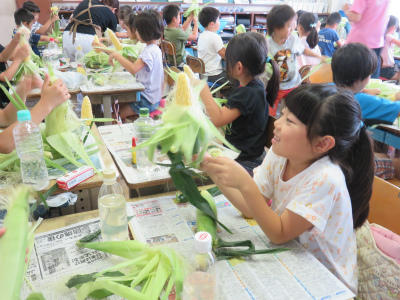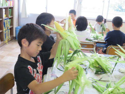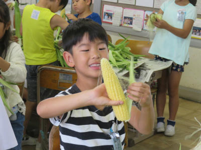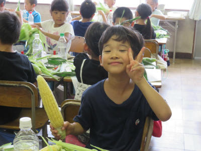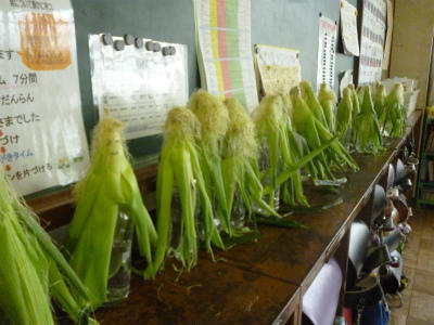 給食室では、トウモロコシがおいしそうに茹で上がりました。今日は、ジャージャー麺と一緒にいただきました。甘くてとてもおいしかったね。