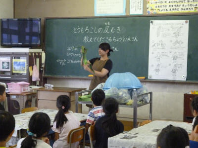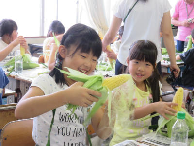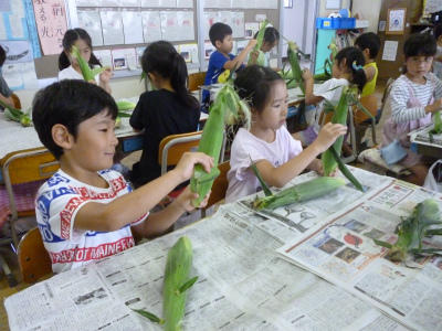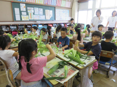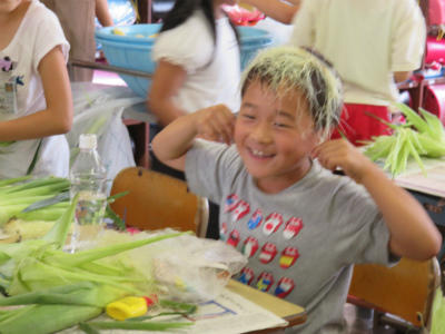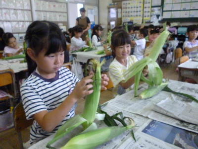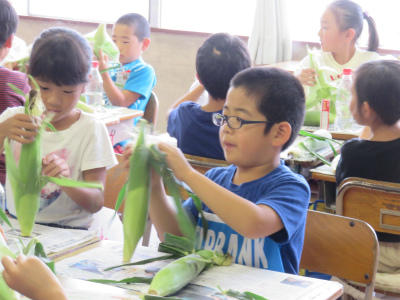 7月1日(月)1校時、2年生が「とうもろこしの皮むき」を行いました。調理員さんにもお手伝いいただき、209本のとうもろこしの皮をむきました。丁寧に皮をむいたり、ひげをとったり、初めて体験する子どももいたようです。きれいな黄色のトウモロコシの実がびっしり。子どもたちは歓声を上げていました。また、剥いた皮とひげで、とうもろこし人形をつくりました。ペットボトルに上手に皮やひげをはりつけました。