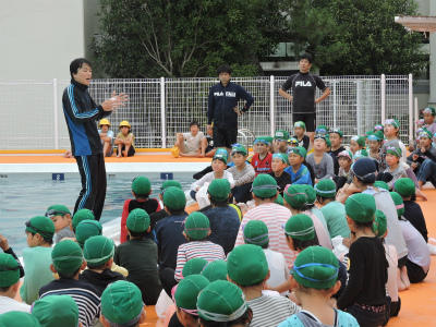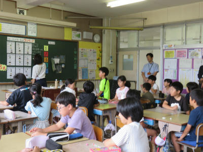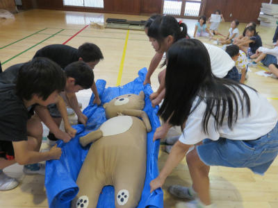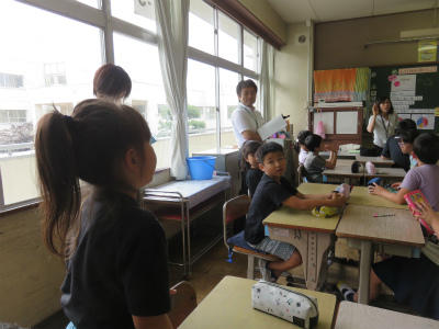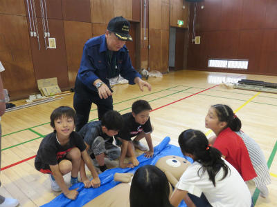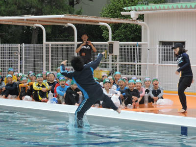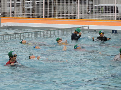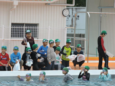 7月3日(水)5校時、4年生を対象に「着衣水泳」の授業を行いました。体育主任が指導にあたりました。これから夏本番。万一に備えて、ペットボトルやビニール袋を使って体を浮かせることを体験しました。また、服が体にまとわりつく怖さを実感できたようです。