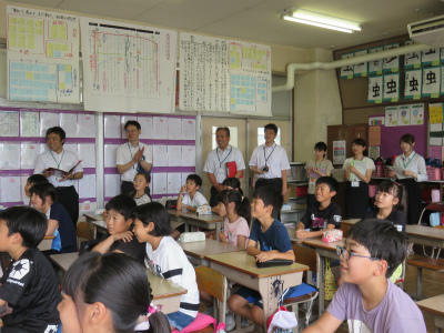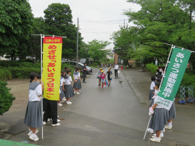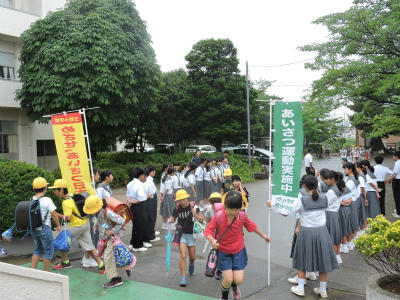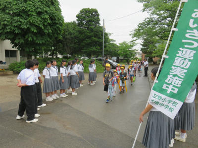 7月2日(火)朝、大増中学校のみなさんが、立野小学校に「あいさつ運動」に来校して下さいました。小学生は、あいさつ通りを元気よく登校してきます。中学生のお兄さん、お姉さんに「おはようございます」と元気な声をかけていただきました。ありがとうございました。