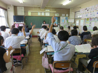 7月2日(火)10:00~大増中学校において、「交流学習」が行われました。今日は、本校の6年生が大増中の3年生と交流学習に臨みました。今日は、国際交流協会から指導の先生をお招きして、それぞれの国の文化について学びました。