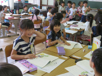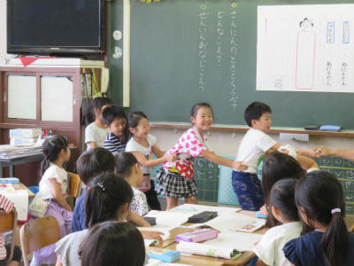 1年2組は「国語」の時間です。「おおきなかぶ」を全員で音読しています。おじいさんやおばあさんになって、かぶをひっぱっているようです。とても楽しそうです。