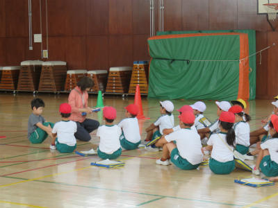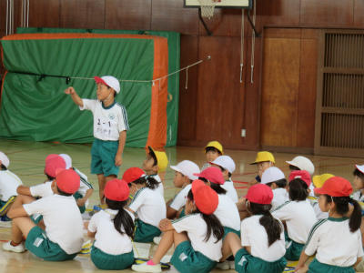 2年1組は、体育館で「体育」の授業です。先生のお話をよく聞き、積極的に発言しています。