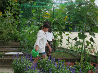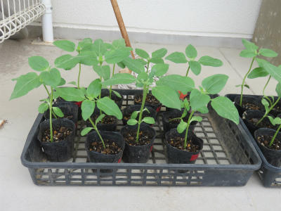 この夏、福島県から分けていただいたひまわりの種を育て、花を咲かせようというプロジェクトに6年生が取り組んでいます。ポットに小さなひまわりが育っています。もう少ししたら、花壇に植え替えるようです。心にも花壇にも大きな花が咲きますように。朝早くから、ありがとうございました。