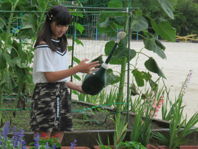 7月8日(月)朝、6年生が愛校活動に取り組んでいます。今日は、花壇の水やりです。