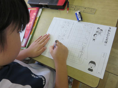 国語では、「うれしいことば」の単元から、人を喜ばせたり、うれしくさせたりする働きがあることを学びました。