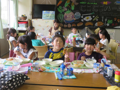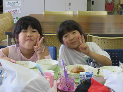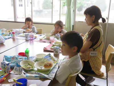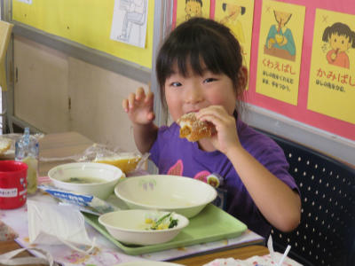 7月10日(水)昼、今日は1年3組がにこにこルームで給食を食べました。にこにこルームでは、3班に分かれて、みんなで一緒に給食を食べることができます。今日は、焼きカレーパンです。おいしそうに、そして楽しそうに給食の時間を過ごしていました。いつもの教室とはちょっとちがった雰囲気ですね。残さずしっかり食べようね。