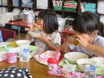 7月27日(金)11:30、フルーツランドにて昼食です。カレーライスをとても美味しそうに食べています。林間学校、みんなで食べる最後の食事です。思い出がたくさんできましたね。