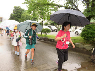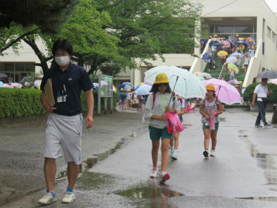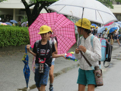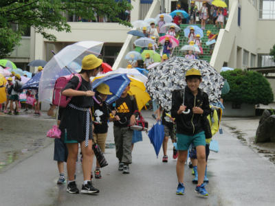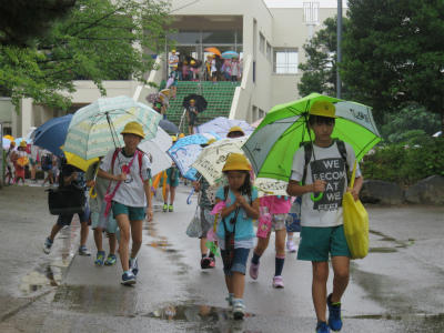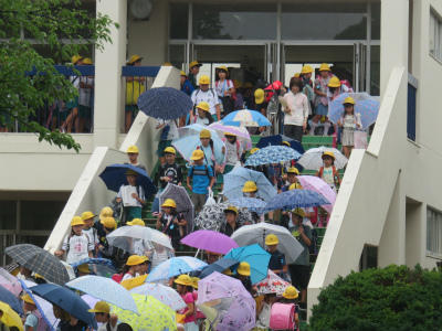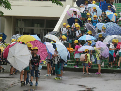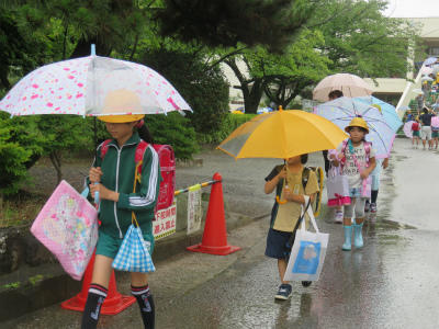 下校時は、傘の花が咲いたようです。大勢の子どもたちが一度に下校します。近隣のみなさまにもいつも声をかけていただいています。ありがとうございます。