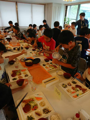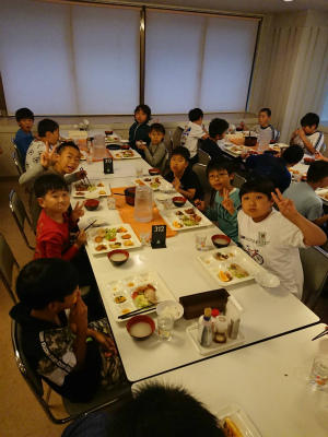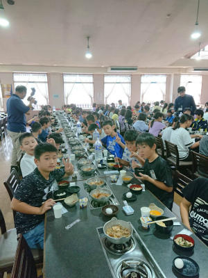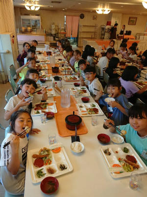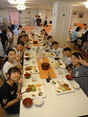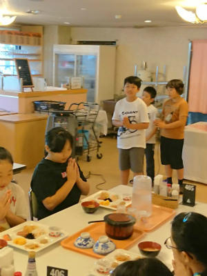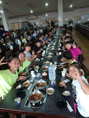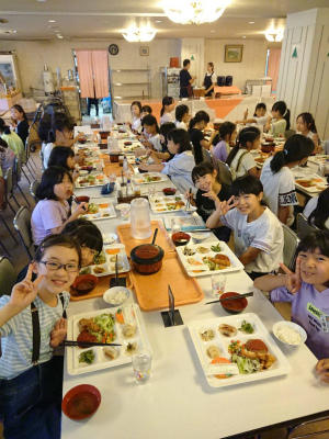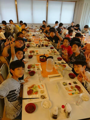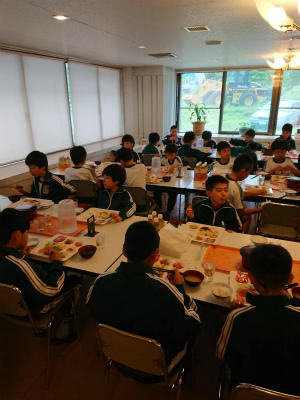 7月26日(金)7:00、朝食です。全員元気に食堂に集まりました。ハム、スクランブルエッグ、ポテトサラダなどです。元気一杯ほおばっている様子がうかがえます。ジャージを着ている子どもが多いのを見ると、山の朝の気温は少し低めなのでしょうか。すがすがしい朝ですね。