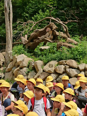 7月25日(木)13:35、地獄谷野猿公苑到着しました。お猿さんが、すぐそこにいますね。かわいいですね。予定では、ここでクラス写真です。みんな半袖になっているところを見ると、気温が少し上がっているかもしれません。いい天気のようです。