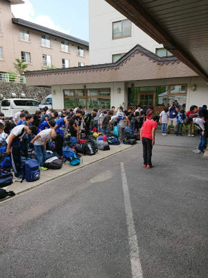 体調不良を訴えている子どもが若干名いるようですが、全員出発はできそうです。万一に備えて、体調不良者はバスでの移動も考えています。