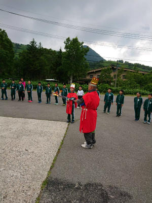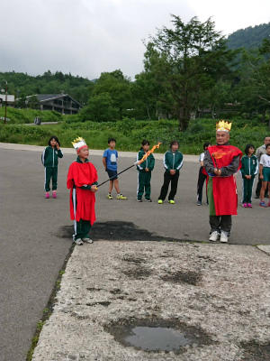 7月22日(月)朝、5年生の林間学校はもうすぐです。7月25日(木)から2泊3日で志賀高原に出かけます。今日は、5年生の先生方がキャンプファイヤーの準備に追われています。火の神の衣装の確認の最中です。林間学校が楽しみですね。