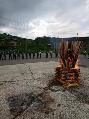 7月26日(金)14:50、雨の心配があるので、時間を早めてキャンプファイヤーを実施しています。火の神の教頭先生もなかなか決まっています。みんなとても楽しそうです。大きな火を囲んで、大切な時間を過ごしてください。友達の手の暖かさ、火の匂い。みんないい思い出になることでしょう。