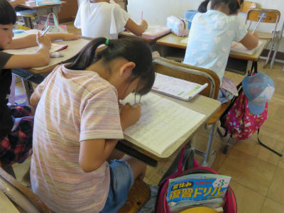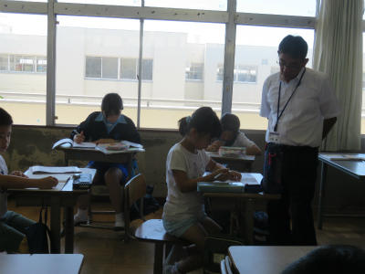 7月26日(金)9:00~、「中学生との勉強会」です。今日も3名の大増中生に御来校いただきました。お忙しい中、ありがとうございます。小学生は、慣れてくるとおしゃべりをしてしまったり、集中力が切れてしまうのかしら???せっかくの機会だから、いろいろなことを学ぼうね。