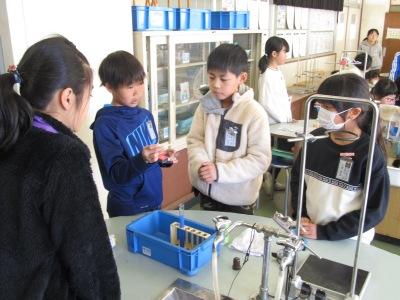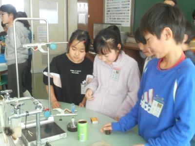 2月6日(木)3校時、理科室において4年2組の理科「もののあたたまり方を調べよう」の授業が行われました。前時には金属の温まり方を勉強しました。今日は、水の温まり方についての学習です。試験管に示温インクを入れ、アルコールランプで熱を加えてみました。水と金属ではあたたまり方が違うことがわかりました。