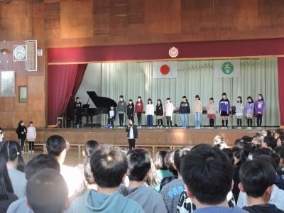 2月12日(水)朝、体育館において音楽朝会が開かれました。今月の歌「ビリーブ」をみんなで歌いました。