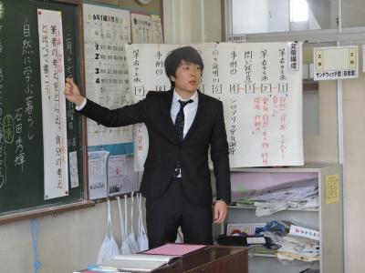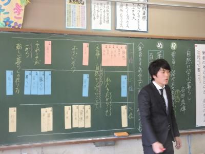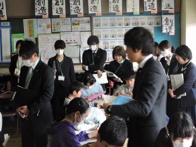 全教員が公開授業に臨みました。4校時は2年1組並木知子教諭による国語「おにごっこ」の研究授業、5校時は6年1組山﨑一洋教諭による「自然に学ぶ暮らし」の研究授業が行われました。