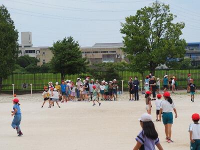 1・2年の生活科の学習で、「みんななかよし大会」を行いました。1・2年生がグループをつくり、校庭で楽しく遊びました。1年生をリードする2年生は、すっかりお兄さん、お姉さんになりました。