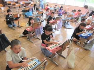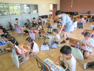 音階に合わせて立ちあがって音の高さの違いを体で感じたり、鍵盤ハーモニカで運指の練習をしていました。