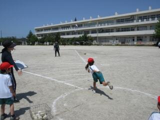 1年生は、青空の下、ボール投げと50m走の測定を行っていました。