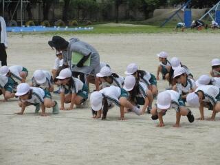 伝統の立野っ子体操。2年生も去年の1年間でカエル倒立ができるようになりました。