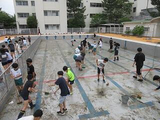 6月から始まる水泳学習に向けて、5・6年生でプールの清掃を行いました。プールの壁面や底、プールサイドにこびりついた汚れをかき集め、擦り落とし、水で流します。時折、雨がぱらつき、強い風が吹く中での作業でしたが、肌寒さをものともせず、精一杯きれいにしてくれました。