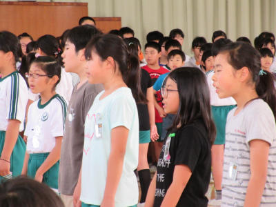 5月24日(水)朝、体育館において「音楽朝会」が開かれました。本当に立野小学校の子どもたちの歌声は素晴らしい。上級生のお兄さん、お姉さんの透き通った歌声を1年生も耳を澄まして聞いています。しっかりと大きな口を開けて発声しています。姿勢も正しく、胸を張っています。質の高い文化に触れると、心も豊かに育ちますね。