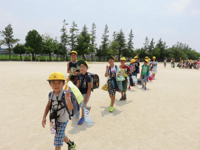 7月19日(水)「一斉下校」が行われました。まず、安全部佐々木先生から「1学期を振り返って」「夏休みの安全について」の話がありました。特に下校後の自転車の乗り方、ゲリラ豪雨、雷などへの対応について、注意喚起を呼びかけました。その後、地区ごとに集まり、1学期の振り返りを行いました。最後に校長先生からは、「上級生が手本となるような学校にしよう」という話をしました。交通指導員さん、スクールガードリーダーの方々へのあいさつは大きな声でしましょうね。1学期は、明日が最後の登校です。