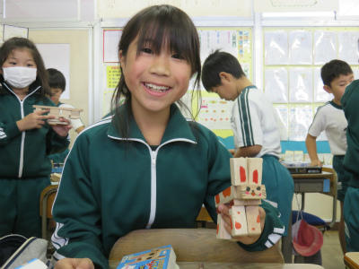 12月13日(木)2校時、3年1組が図工の授業で「のこぎりひいてザク・ザク・ザク」の作品が完成しました。「うさぎ」「白馬」「ピストル」「小物入れ」「飛行機」・・・。上手にできました。みんなの豊かな発想に感動しました。大人になると、この感性をどこかに置き忘れてしまうのでしょうかね。この年齢ならではの作品です。